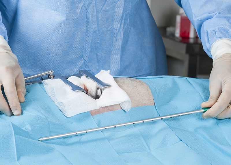 A chest drain can be placed during thoracic surgery using an open technique. This drain includes a trocar.